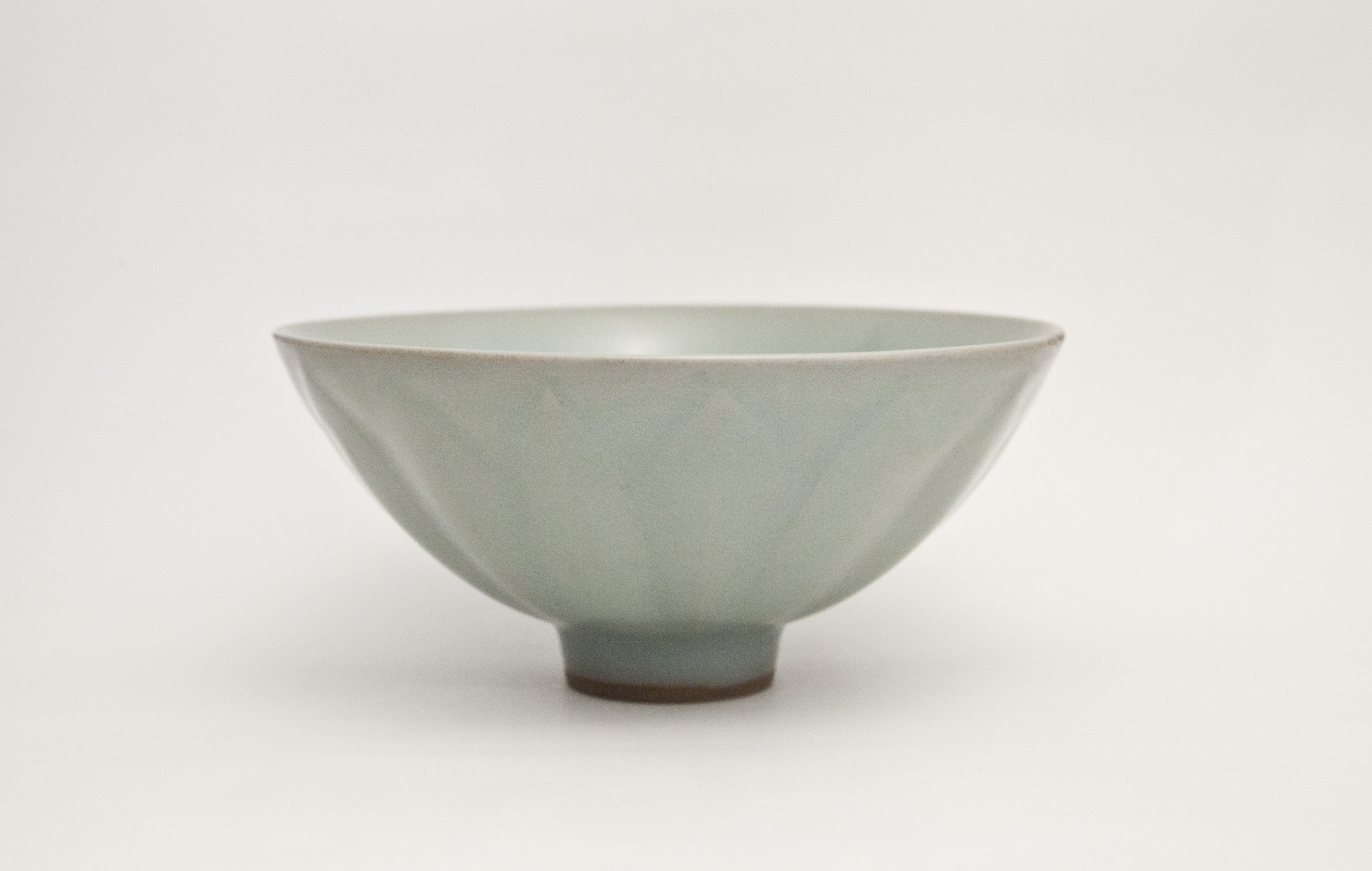 花弁蓮がキレイに刻まれた茶碗。お湯を注ぐと、不思議とサラサラと茶碗の中で響くのは、侘び寂びの茶碗では味わえない妙味。