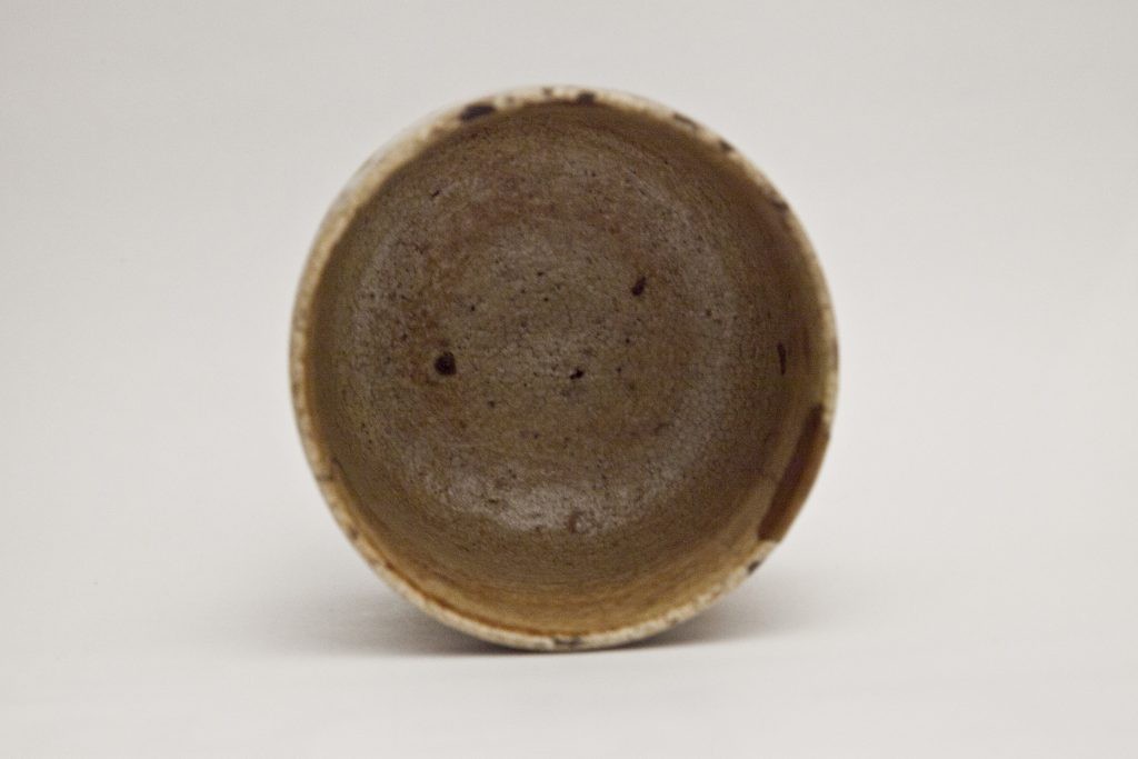 典型的な黄瀬戸の筒茶碗。胴はすとんと垂直に落ち、高台といえるようなものはほぼないといってよい。